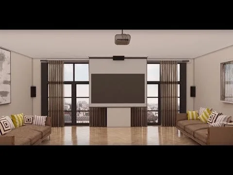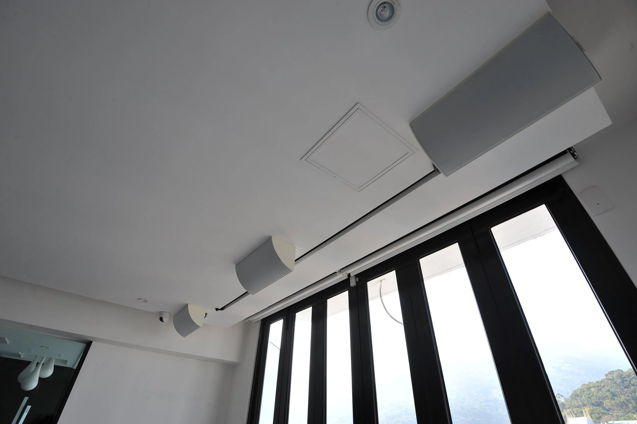 The speakers fit vertically in a corner, horizontally between the wall and the ceiling, above or below the screen and even on the wall or ceiling.